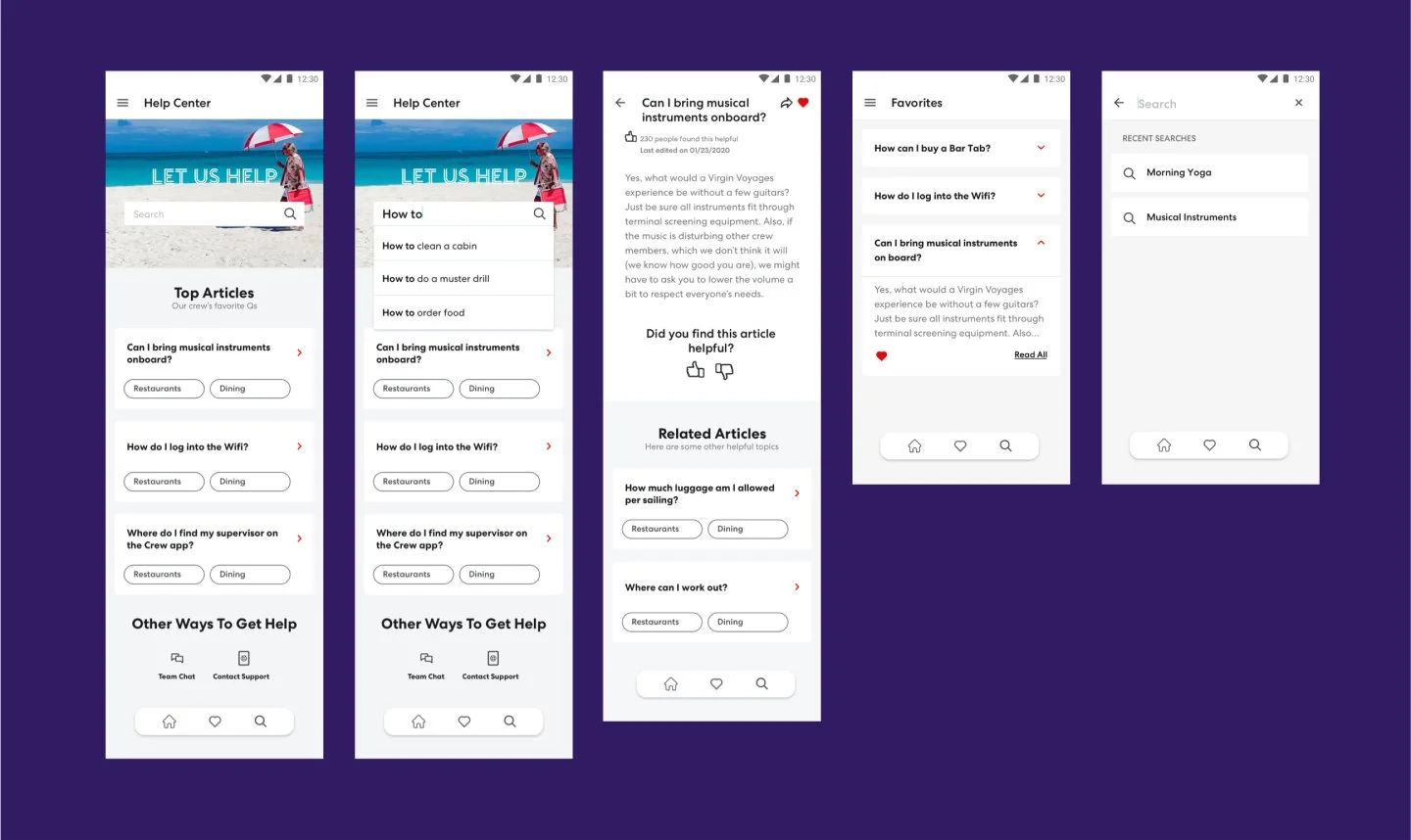 Directing, designing and recommending solutions for each app from start to finish. This included the creation of a UI component library + style guide, custom icon library, wireframes, key design screens, user flows, creative direction, QA, as well as product user testing aboard The Scarlet Lady before she set sail. We are still their proud partner today for this initiative, supporting new feature releases, user testing, and optimizations to the experience.